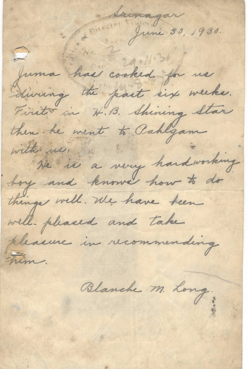 Juma has cooked for us during the past eight weeks first in houseboat then he went pahalgam with us,he is a very hardworking boy and know how to do things well,we have been well pleased and take pleasure by recommending him. Blanche m. hong