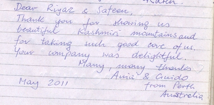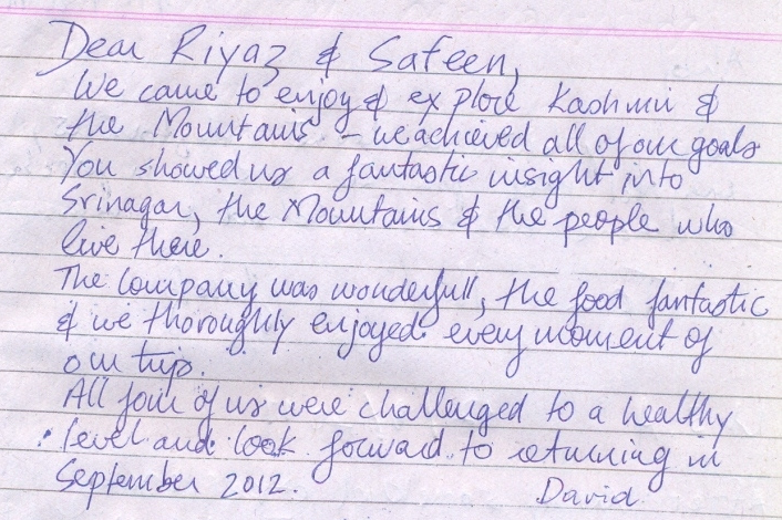 Thanks for taking such good care of us and our belongings whilst we were away. The houseboat was a welcome relief after all the hassles at the airport and tourist centre on our first day – and has been a very pleasant place to stay since. What can I say about the trekking – Ashraf was brilliant, so was the scenery – shame about the pony men!