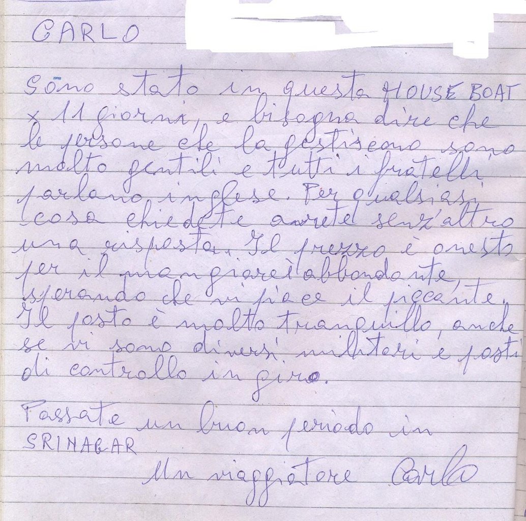 We arrived at Srinagar, coach weary and bum sore, and were greeted by a mob of houseboat touts pressing their services upon us. Luckily we were waving. The Bit book. around in the air so ended up here by a process of recognition. Here has been peaceful and reasonably priced – having heard rumours of rip offs on the Dal lake its nice to know that we’ve found ourselves with an honest trader in Habiboll. Everyone has been very kind and helpful – organizing us for trekking, advising us as to the honest of the various travelling salesmen who frequent the Jhelum and taking us round shops and even the cinema, all o f which has gone to make our stay in Srinagar very pleasant. Love…