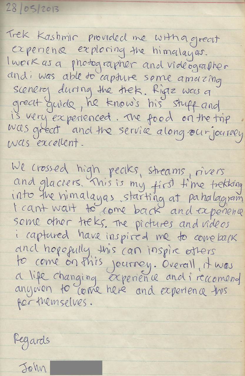 Trek Kashmir is a family run business since the 1970s. Here is a selection of reviews/testimonials from some of our guests.Welcome to our reviews, Testimonial, Feedbacks page. Dear readers I have collected number feedback’s and reviews from different public forms and personal blogs. I have also collected some reviews from my blog to put it together for better understand with some old reviews when internet was not invented. The idea to collect this information will help you as trekker to know more about this area by the words of previous travelers and you will prepare better.Budget trek Kashmir is recommended by number travelers form guide book sites. Tripoto has two stories about Kashmir trekking. First reviews.and Second reviews. It is a social travel platform to share and discover Travel experience. Indianmike A community generated and curetted travel site. BCM TOURING. Google Sites is India’s friendliest travel community site. google sites are a structured wiki and webpage creation tool offered by Google.Abhinesh Jana Hi I am with camera who is passionate about Photography.. Trek Pedition The public form Backpackers Taiwan And Blog Taiwan