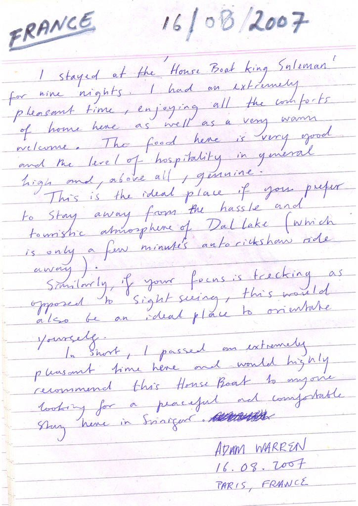 I stayed at the ‘House Boat King Suleman’ for nine nights. I had an extremely pleasant time, enjoying all the comforts of home here as well as a very warm welcome. The food here is very good and the level of hospitality in general high and, above all, genuine.