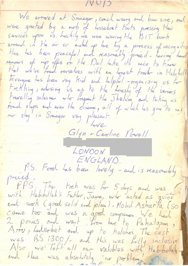Glyn and Caroline Powell, London, England in Mid seventies Bit Guide Book was recommendation our family for trekking in Kashmir