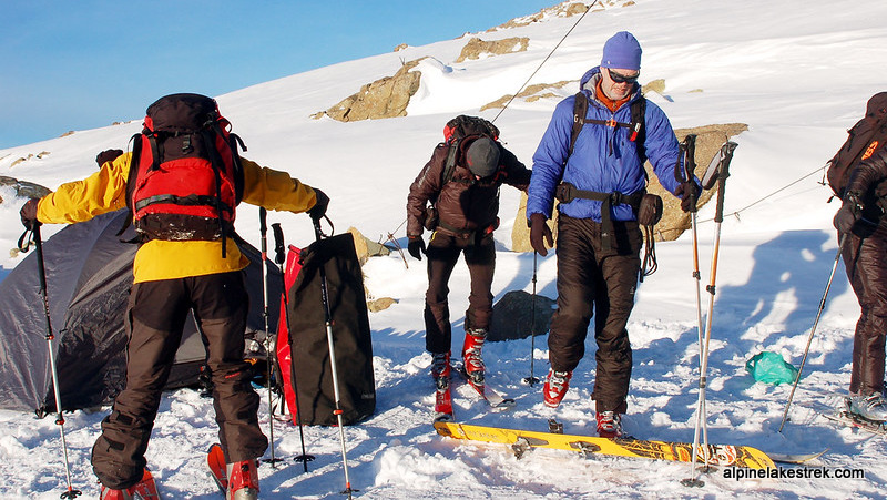 Für eine großzügige Regeneration ist aber auch hier keine Zeit. Wir wollen das Gletscherplateau verlassen ehe das Wetter noch schlechter wird. Allein die Vorstellung die steilen Hänge unter uns bei vielleicht einem halben Meter Neuschnee zu fahren ist nicht lustig. Neuschnee haben wir dann keinen, aber es ist unten warm geworden und der Schnee ist faul und die die Lawinensituation nicht zu unterschätzen. Mit unseren üppigen Rucksäcken in diesen tiefen Baatz würden wir auch nicht die besten Haltungsnoten für unsere Skitechnik bekommen. Aber uns schaut hier keiner zu. Kaum haben wir das Liddervalley erreicht, wo wir uns in Sicherheit wiegen dürfen, fängt es an zu regnen. Windstiller Schnürlregen. Und es regnet den ganzen Nachmittag, und auch am nächsten Tag pisst es ohne Unterlass und als wir angenehm ermattet in Aru eintreffen haben wir trotz High-Tech-Membranklamotten keinen trockenen Faden mehr am Leib.